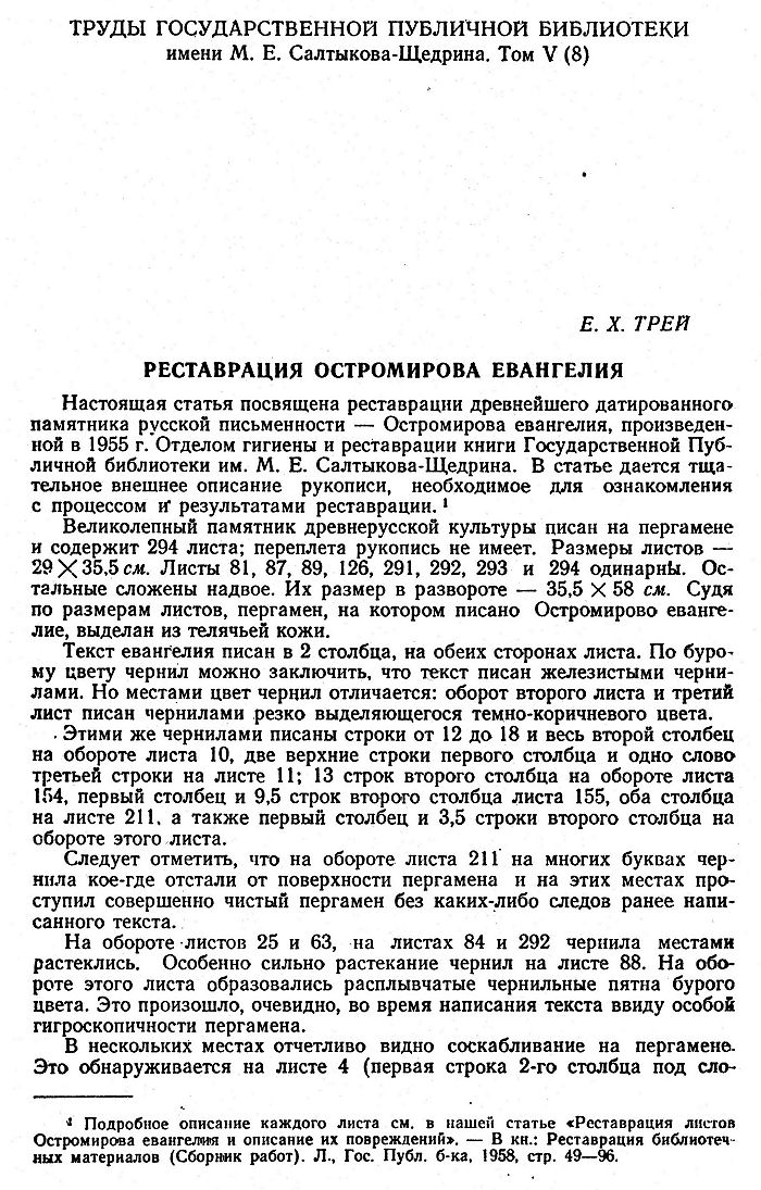 Настоящая статья посвящена реставрации древнейшего датированного памятника русской письменности — Остромирова евангелия, произведенной в 1955 г. Отделом гигиены и реставрации книги Государственной Публичной библиотеки им. М. Е. Салтыкова-Щедрина. В статье дается тщательное внешнее описание рукописи, необходимое для ознакомления с процессом и результатами реставрации. [1]