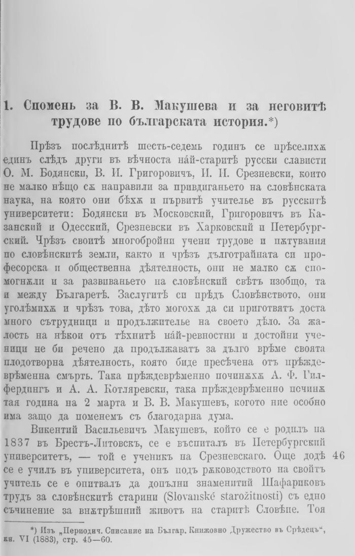 Прѣзъ послѣднитѣ шесть-седемь годинъ се прѣселихѫ единъ слѣдъ други въ вѣчноста нáй-старитѣ русски слависти О. М. Бодянски, В. И. Григоровичъ, И. И. Срезневски, които не малко нѣщо сѫ направили за привдиганьето на словѣнската наука, на която они бѣхѫ и първитѣ учителье въ русскитѣ университети: Бодянски въ Московский, Григоровичъ въ Казанский и Одесский, Срезневски въ Харковский и Петербургский. Чрѣзъ своитѣ многобройни учени трудове и пѫтувания по словѣнскитѣ земли, както и чрѣзъ дълготрайната си профессорска и общественна дѣятелность, они не малко сѫ спомогнѫли и за развиваньето на словѣнската мисъль, на словѣнското съзнание между словѣнский свѣтъ изобщо, та и между Българетѣ. Заслугитѣ си прѣдъ словѣнството, они уголѣмихѫ и чрѣзъ това, дѣто могохѫ да си приготвятъ доста много сътрудници и продължители на своето дѣло. За жалость на нѣкои отъ тѣхнитѣ нáй-ревностни и достойни ученици не би речено да продължаватъ за дълго врѣме своята плодотворна дѣятелность, която биде пресѣчена отъ прѣждеврѣменна смърть. Така прѣждеврѣменно починѫхѫ А. Ф. Гилфердингъ и А. А. Котляревски, така прѣждеврѣменно починѫ тая година на 2 марта и В. В. Макушевъ, когото ние особно има защо да поменемъ съ благодарна дума.