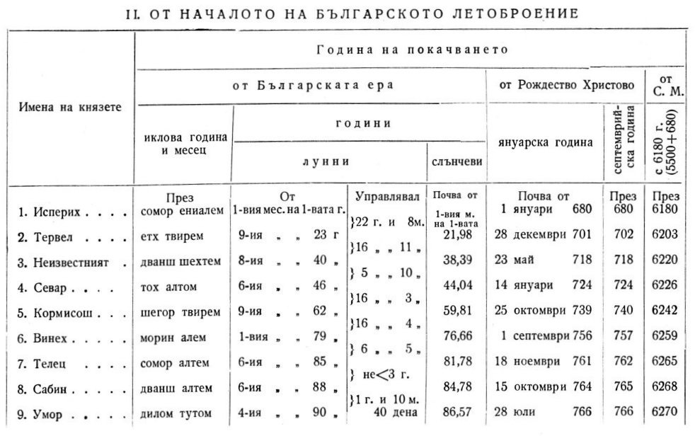 На следните две страници даваме две таблици, в които са представени резултатите на нашите изчисления за двете части на Именника. При това считаме за нужно да дадем следните пояснения: 1. В таблица I под „управлявал” са посочени закръглени години, както те са показани в Именника. 2. Изразът „не < 3 год.”, значи „не повече от 3 години” ; например Телец е управлявал не повече от 3 години (същото значение имат „не < 1 год.” и „не < 2 год.”). 3. Изразът „почва от” значи, че съответният месец на дадена лунна година почва от еди-коя си слънчева година от Р. Хр. или Б. Е., или от еди-кое си число на известен месец в януарската слънчева година от Р. Хр. Например Авитохол се покачил от 9-ия месец на 150 лунна година от Р. Хр., а това отговаря на 145,17 слънчева година от Р. Хр., или 9-ия месец на 150 лунна година от Р. Хр. почва от 3 март 146 януарска година от Р. Хр., с други думи, Авитохол се покачил през март или 1 или 2 април 146 год. от Р. Хр.; — друг пример: Севар се покачил от 6-ия месец на 46 лунна година от Б. Е., а това отговаря на 44,04 слънчева година от Б. Е., или б-ият месец на 46 лунна година от Б. Е. почва от 14 януари 724 януарска година от Р. Хр., с други думи, Севар се покачил през втората половина на януари или през първата половина на февруари 724 г. от Р. Хр. 4. Там, дето месецът на цикловата година не е известен, туряме само „през” еди-коя си година, защото датата не може поточно да се определи, а в графите „почва от” е означено откога почва самата година.